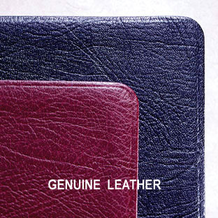 Genuine LeatherGenuine Leather differs from Bonded Leather in that it consist of a single piece of leather, not many bonded pieces. Genuine Leather is made from first quality animal hides (usually pig or cowhide). It has a finely grained texture, and with proper care, Genuine Bibles should last a lifetime. (Note: The above pictures of Genuine leather are to depict the style of leather only not the actual colors. Shades of Black and Burgundy Bibles may be lighter or darker than those shown here.) |