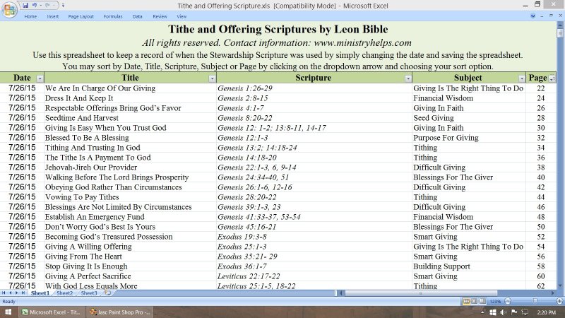 Description: This is an “Excell Spreadsheet Download” for the Book: “Tithe & Offering Scriptures, the Complete Collection,” by Leon Bible. You can see the actual book here.